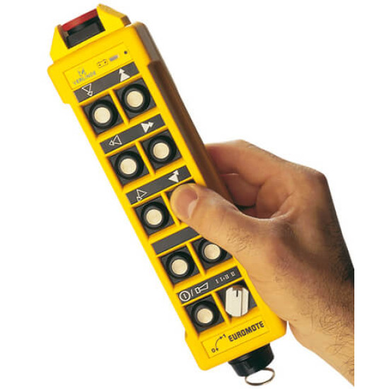 Euromote H este un sistem de telecomanda radio conceput pentru utilizarea cu electropalanele si podurile rulante Verlinde. Este destinat aplicatiilor industriale in care sunt importante siguranta, controlul precis al miscarilor si libertatea de operare, permitand manevrarea echipamentelor de ridicare de la distanta, in conditii de eficienta si confort.